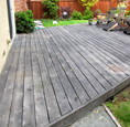 Apply wood stripper if necessary and wash. Apply wood cleaner and wash off. Apply wood brightener to remove blackish grey look to almost new & sand. -